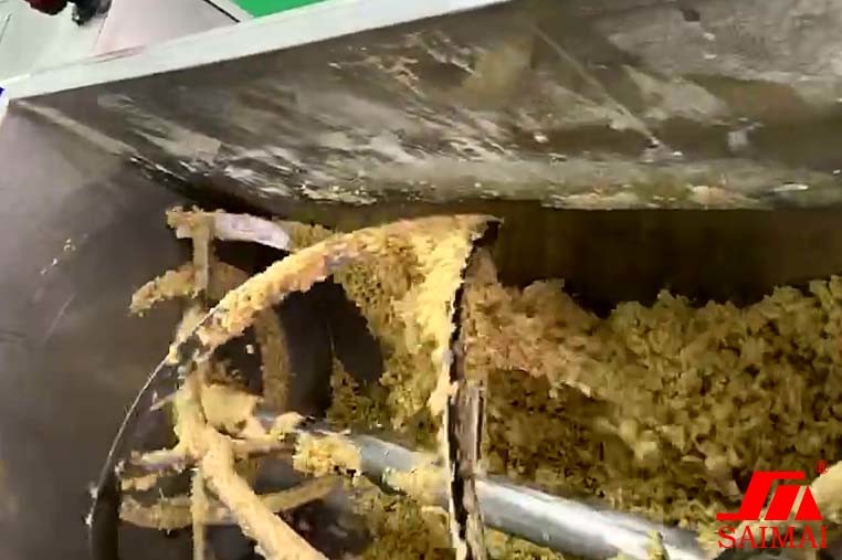 Los ingredientes secos se mezclan con aceite y azúcar para formar un Massachusetts. Live Bottom Bin puso la mezcla abajo para ceñir.